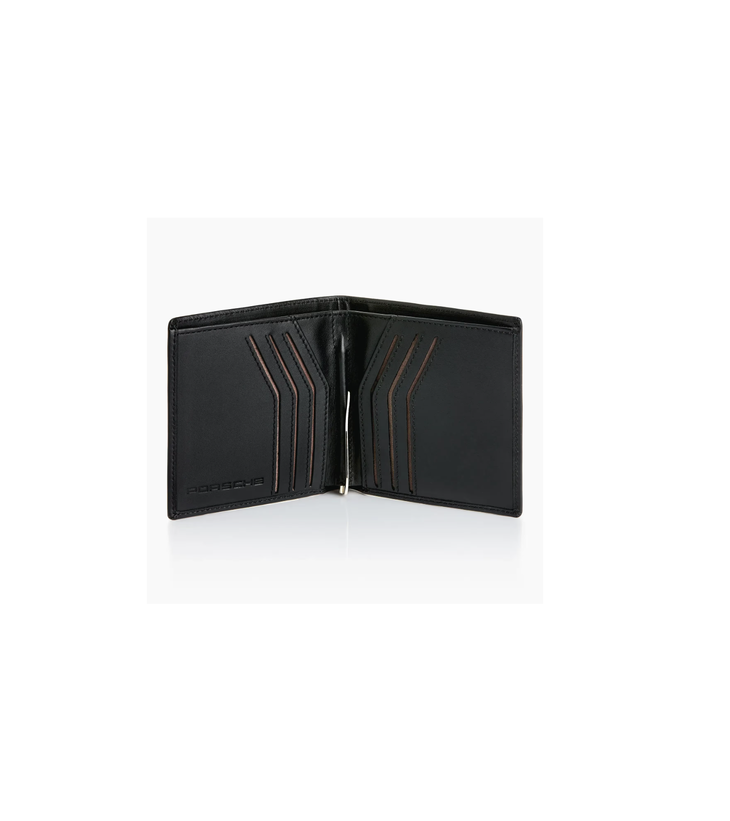 Kiváló minőségű marhabőrből készült hitelkártya-tok dombornyomott Porsche címerrel. Pénzcsipesszel, nagy bankjegytartó rekesszel és nyolc kártyatartó rekesszel.