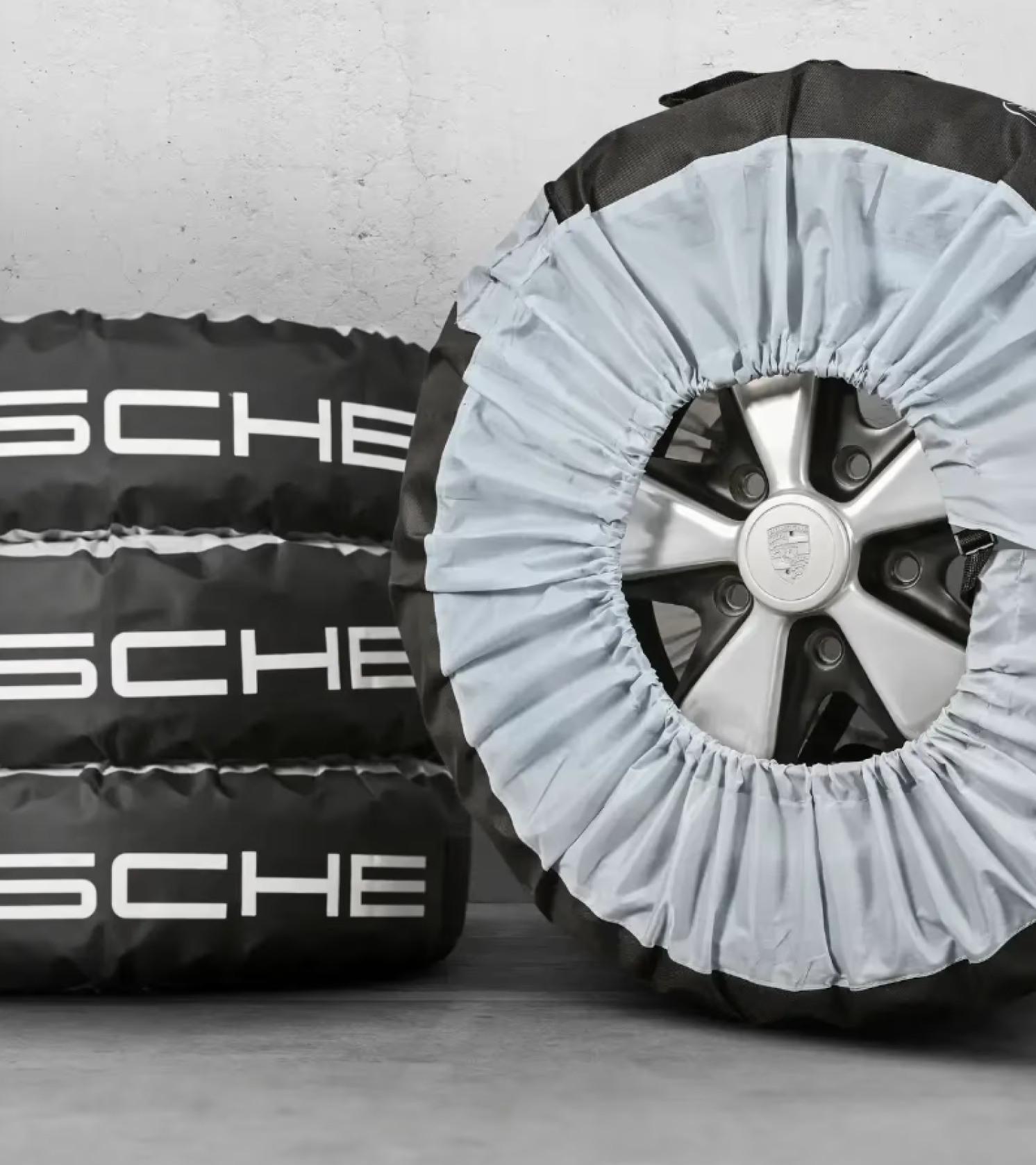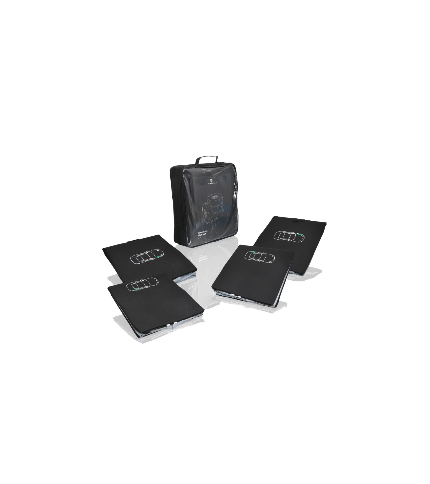 A komplett kerekek tiszta tárolásához: a Porsche Classic keréktáskák (XL méret) 4 darabos készletben 17-21 hüvelyk közötti gumiabroncsméretekhez (2071 mm-től 2310 mm-ig és 661 mm-től 735 mm-ig terjedő gumiabroncs-kerülethez).
