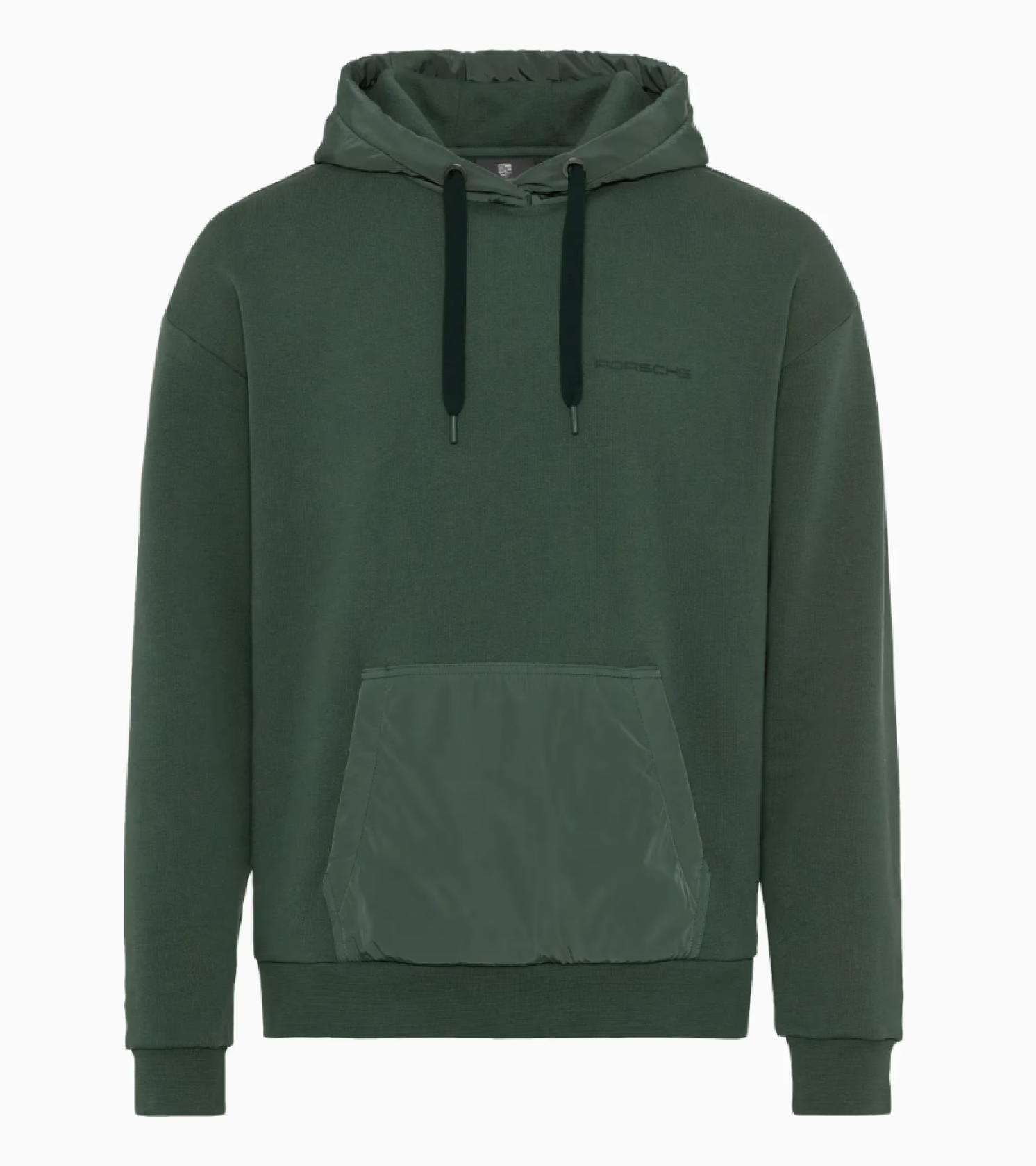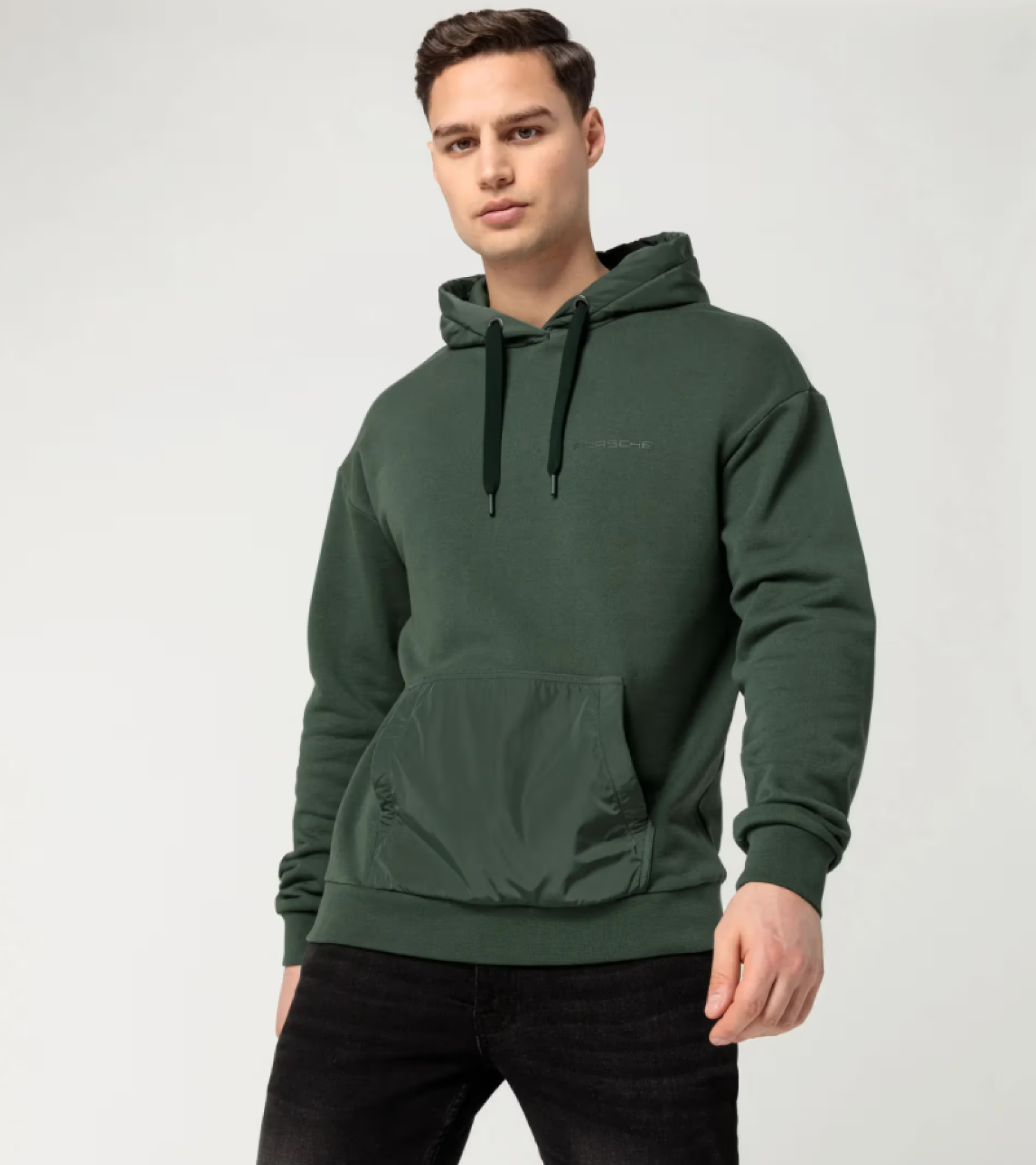 Kenguruzseb és kapucni nejlonból.Porsche felirat az elején.Stílusos unisex kapucnis pulóver nagy Porsche címerrel a hátán.