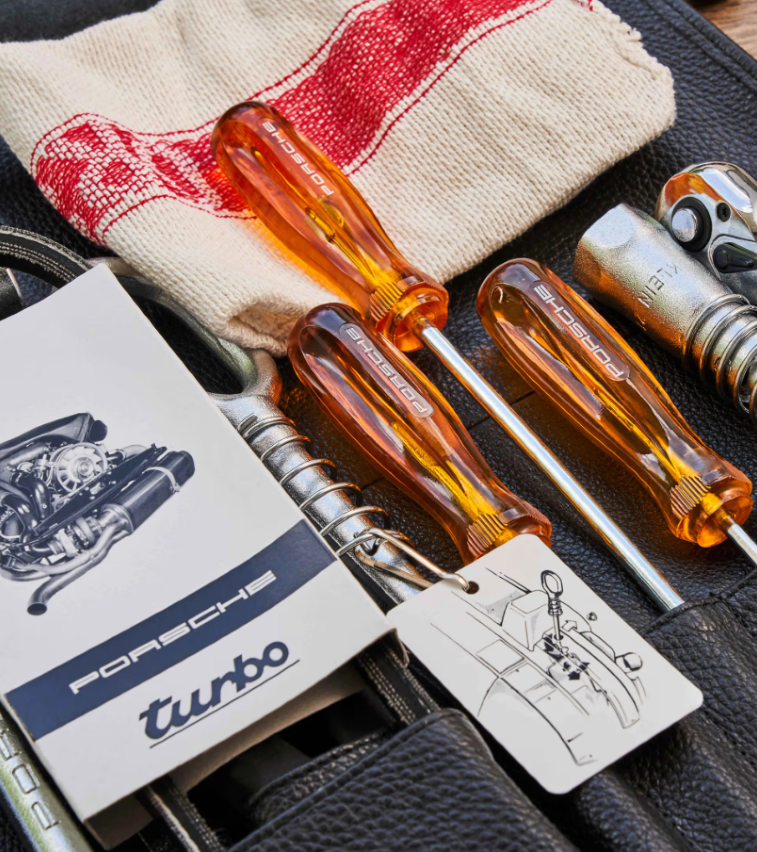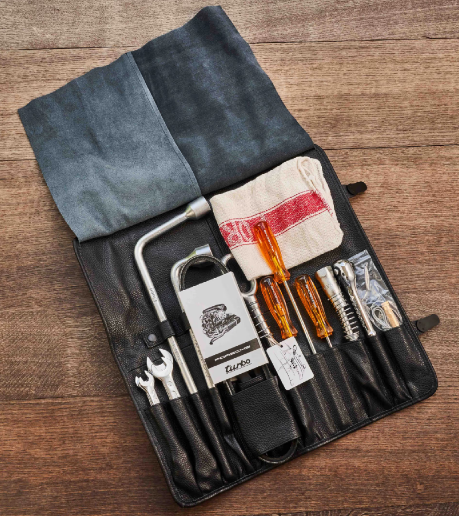 Természetesen az új táskában található összes szerszámnak kijelölt nyílásai vannak. A csavarhúzók nyelei továbbra is sárga műanyagból készültek, de most a Porsche logójával vannak ellátva. A használhatóság javítása érdekében a Porsche Classic az eredeti gyújtógyertya-kulcsot egy praktikusabb racsnira és egy speciális gyújtógyertya-kulcsra cserélte.