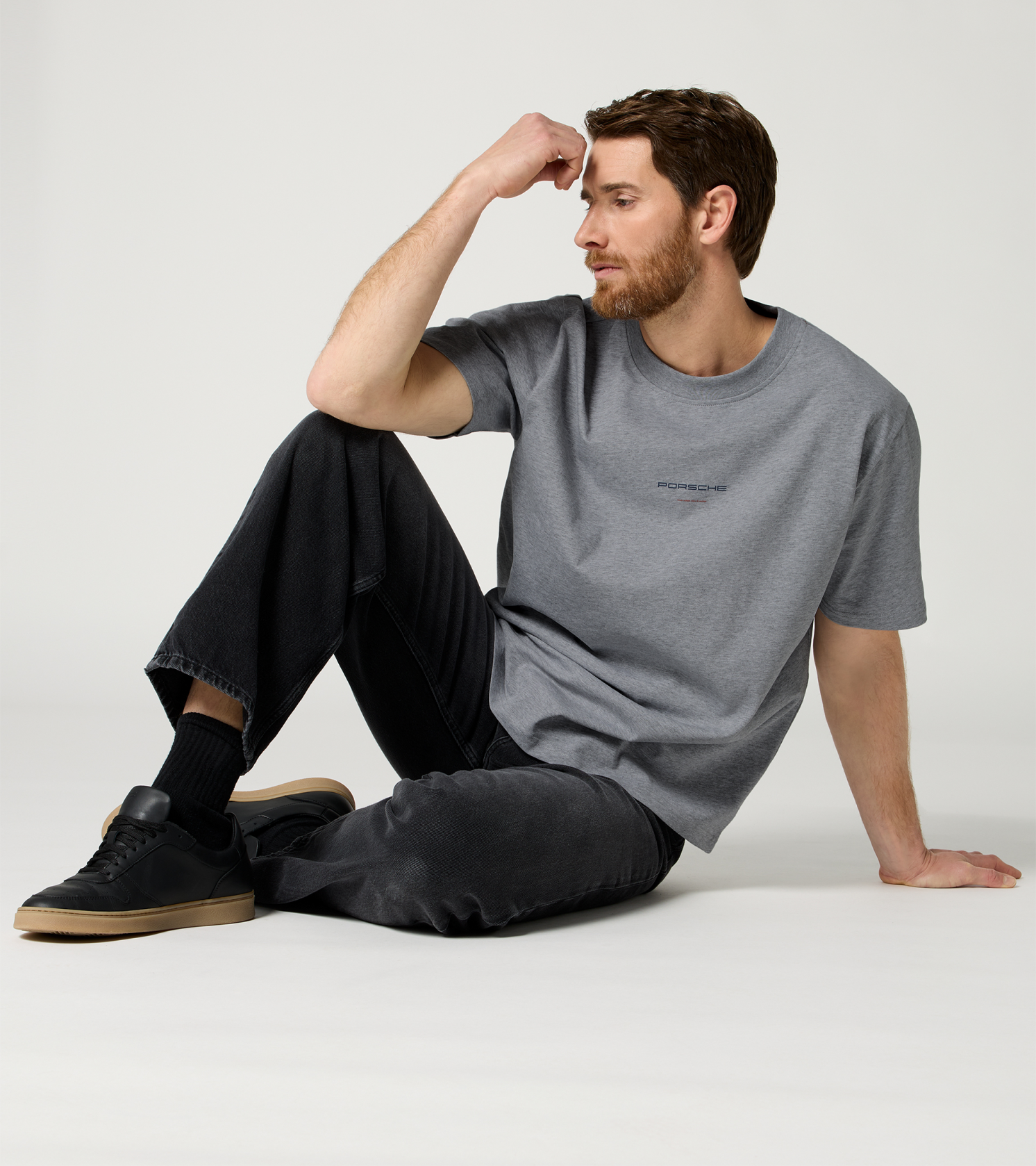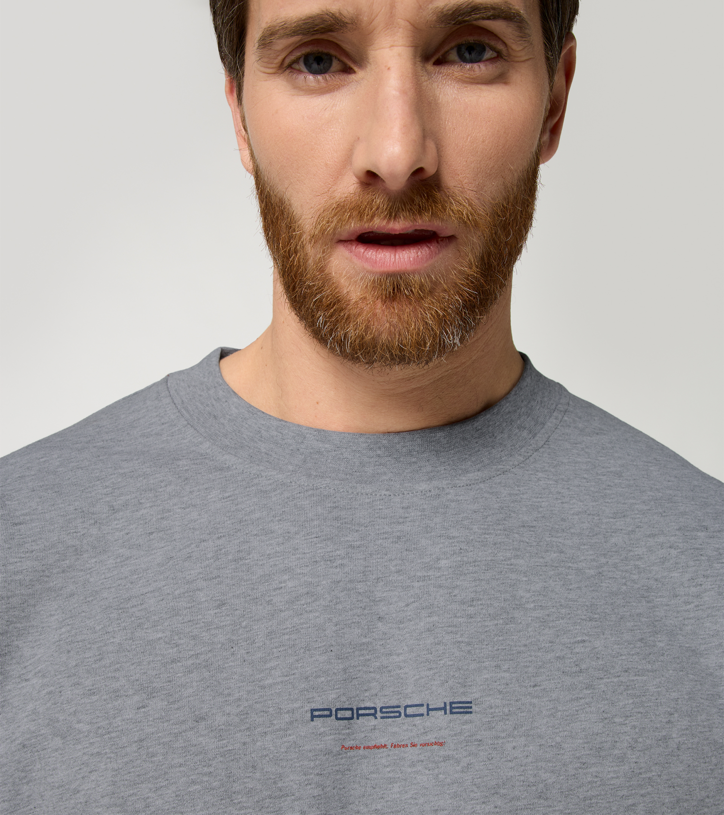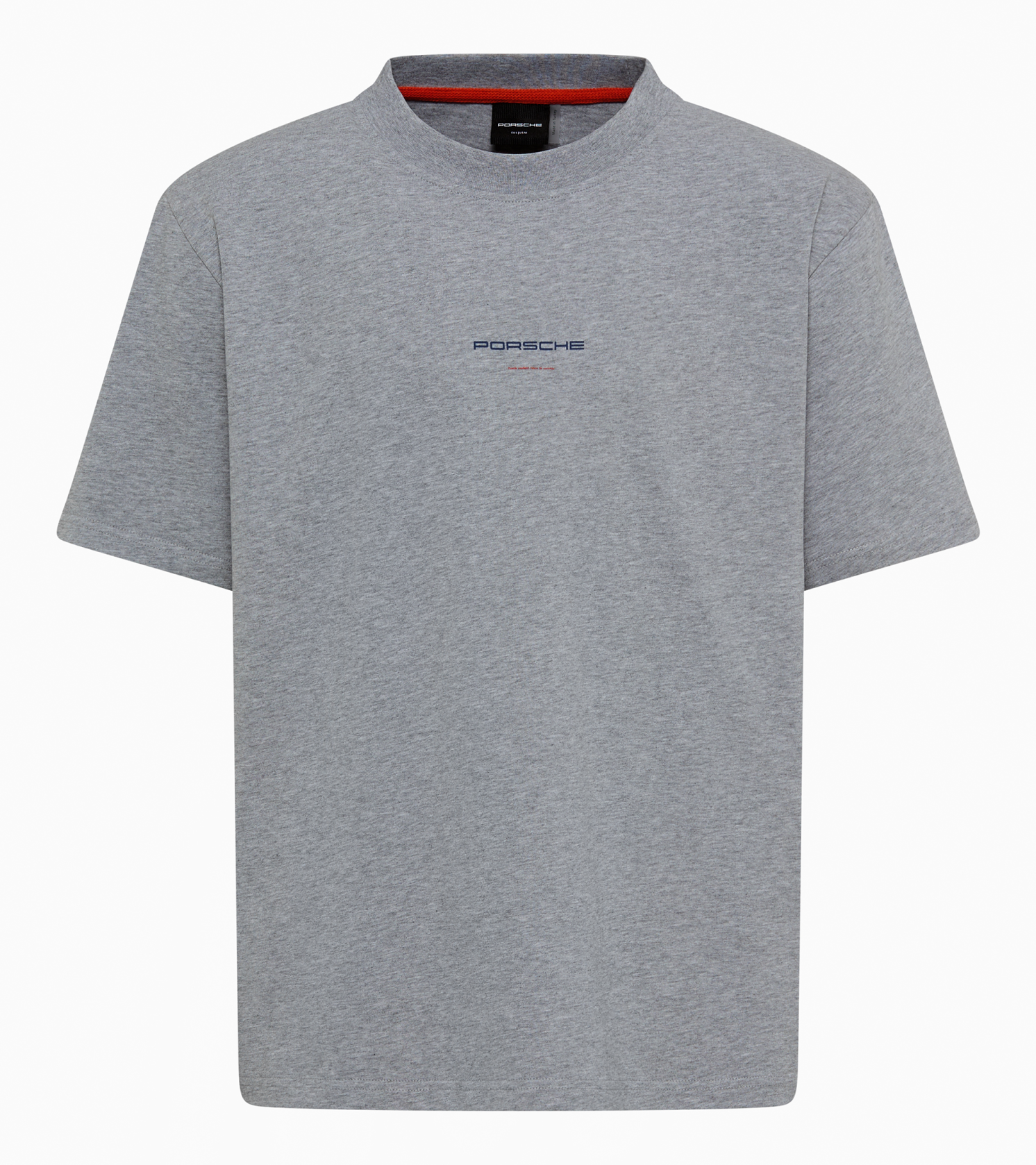Uniszex Porsche póló normál szabásban, feltűnő nyomtatással a hátán és visszafogott márkajelzéssel.