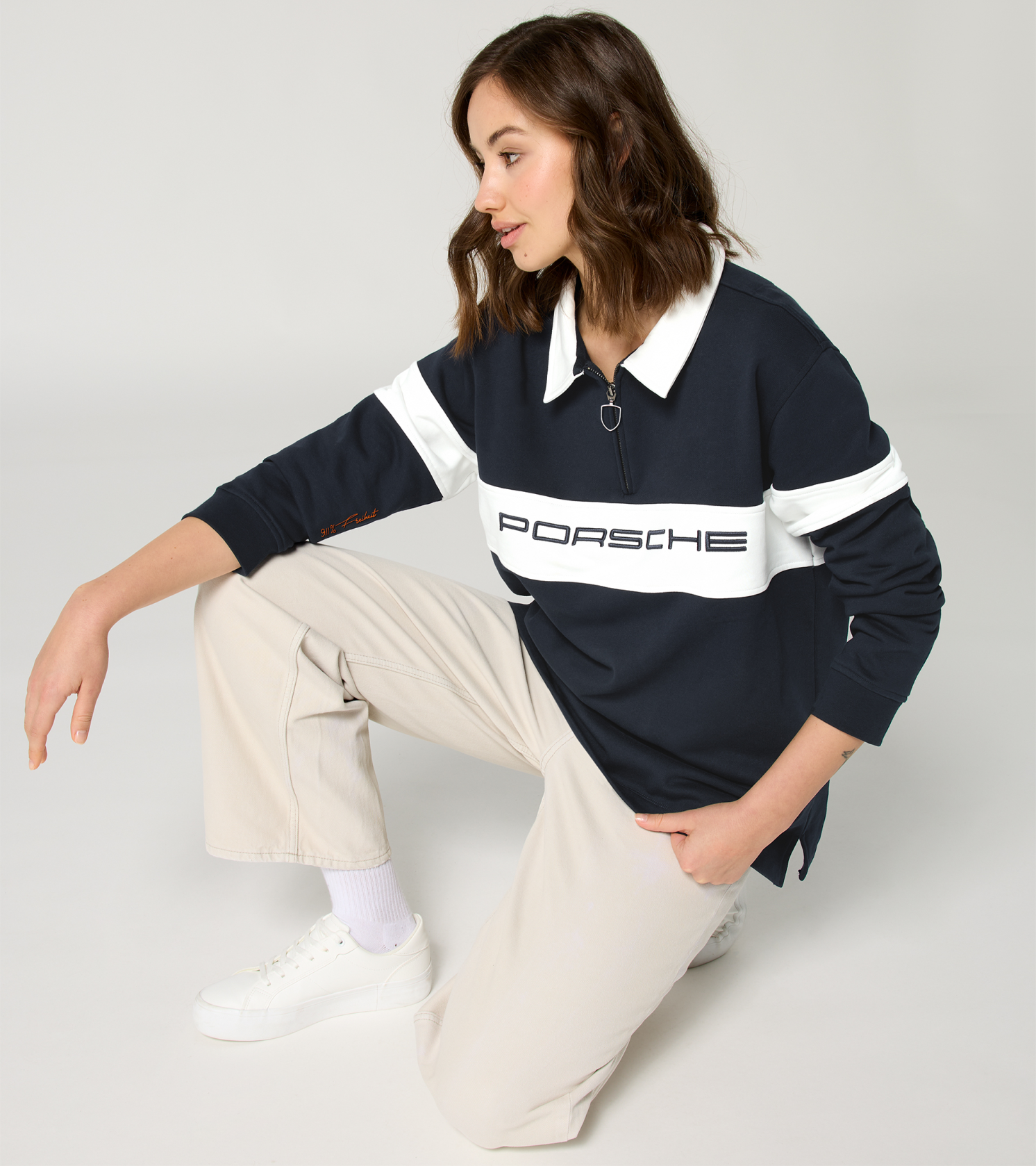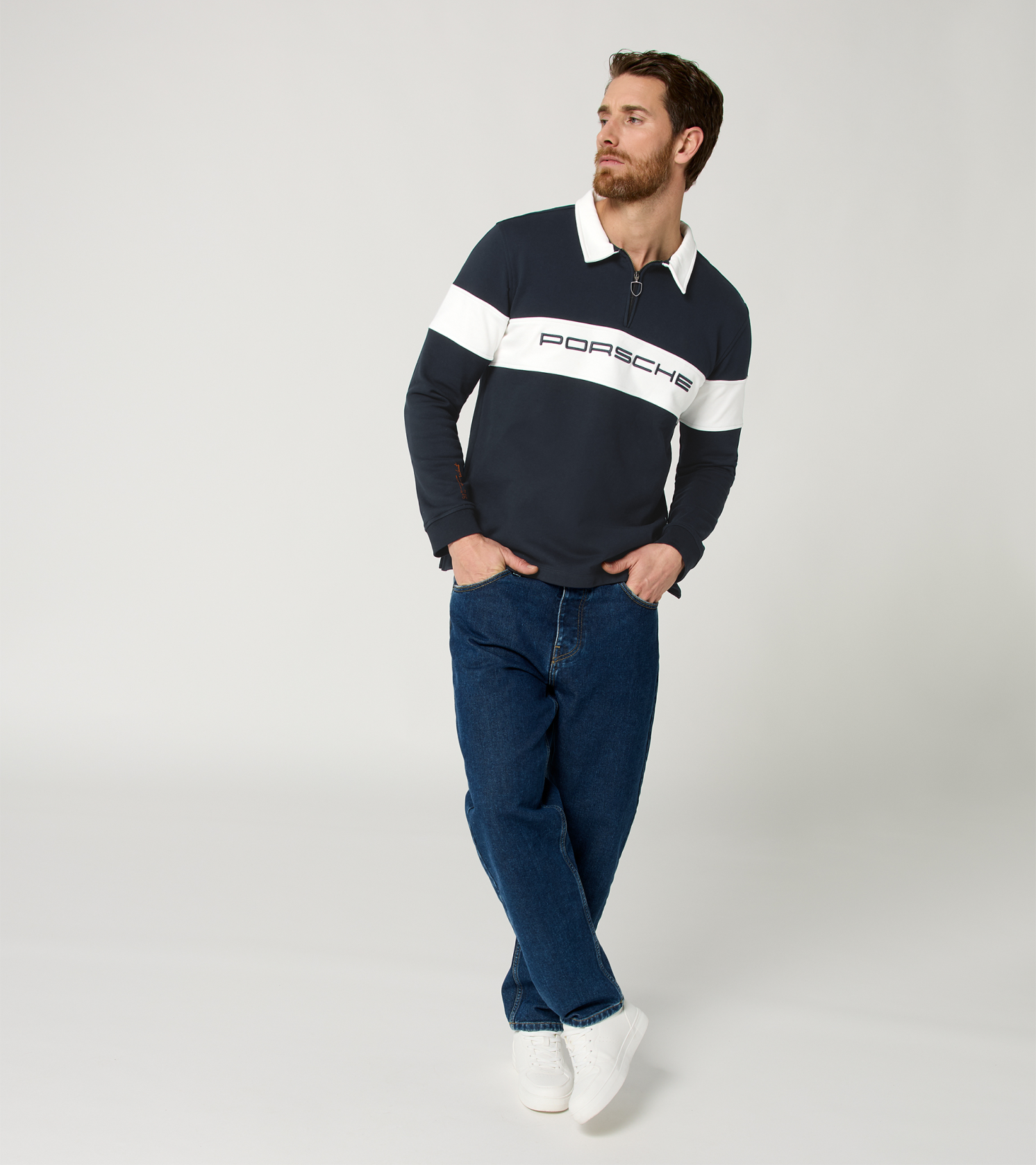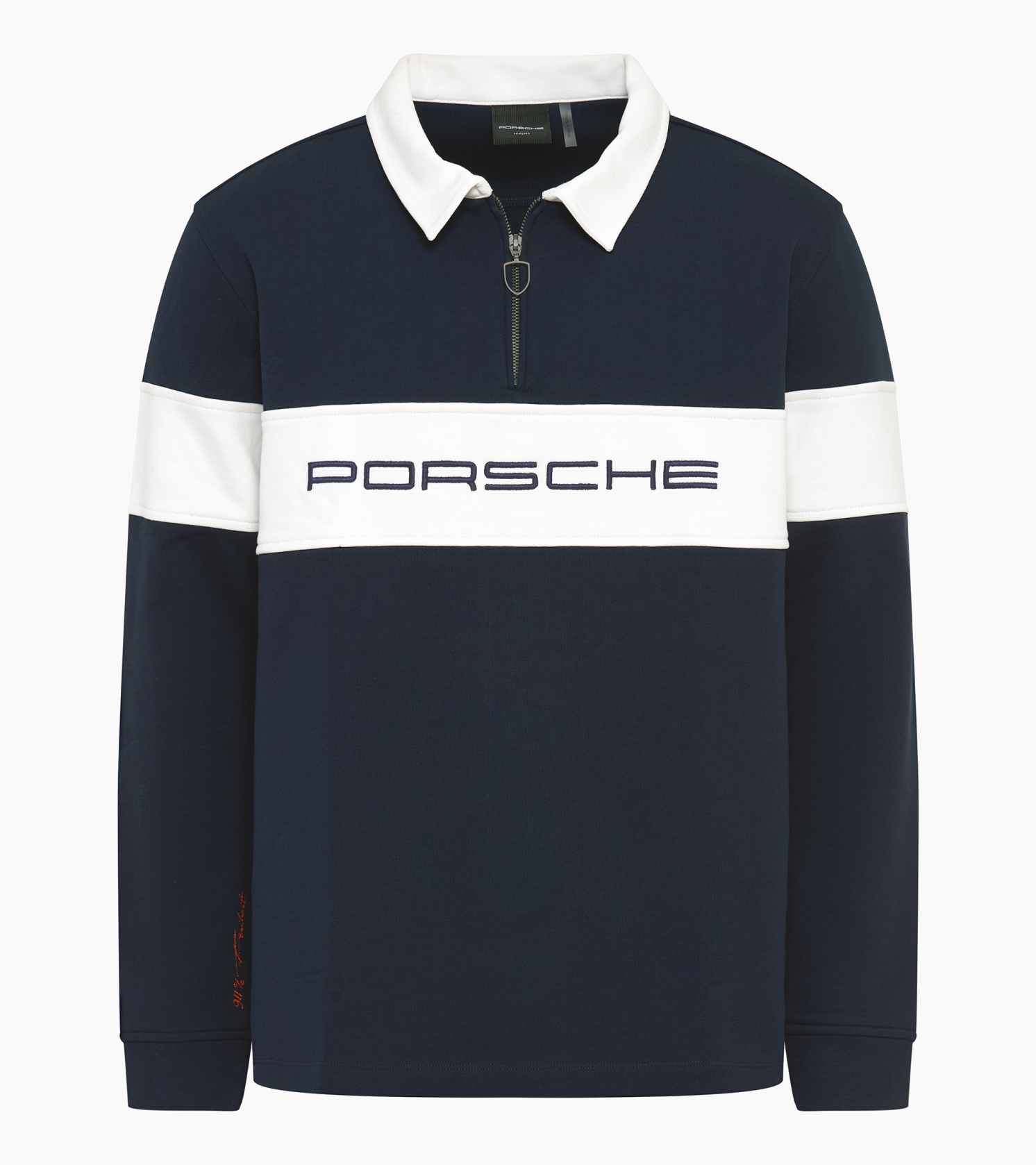 Uniszex Porsche pulóver rögbi stílusú póló klasszikus gallérral, cipzárral és feltűnő márkajelzéssel.