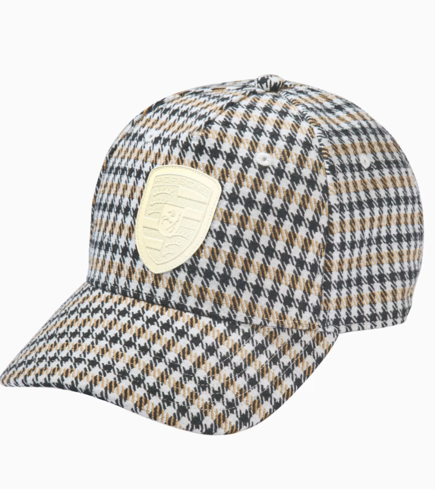 Jacquard anyag tyúkláb mintával.Retro ihletésű dizájn modern részletekkel.Tónusos dombornyomott Porsche címer az elején.Állítható bőrszíj fém csattal.