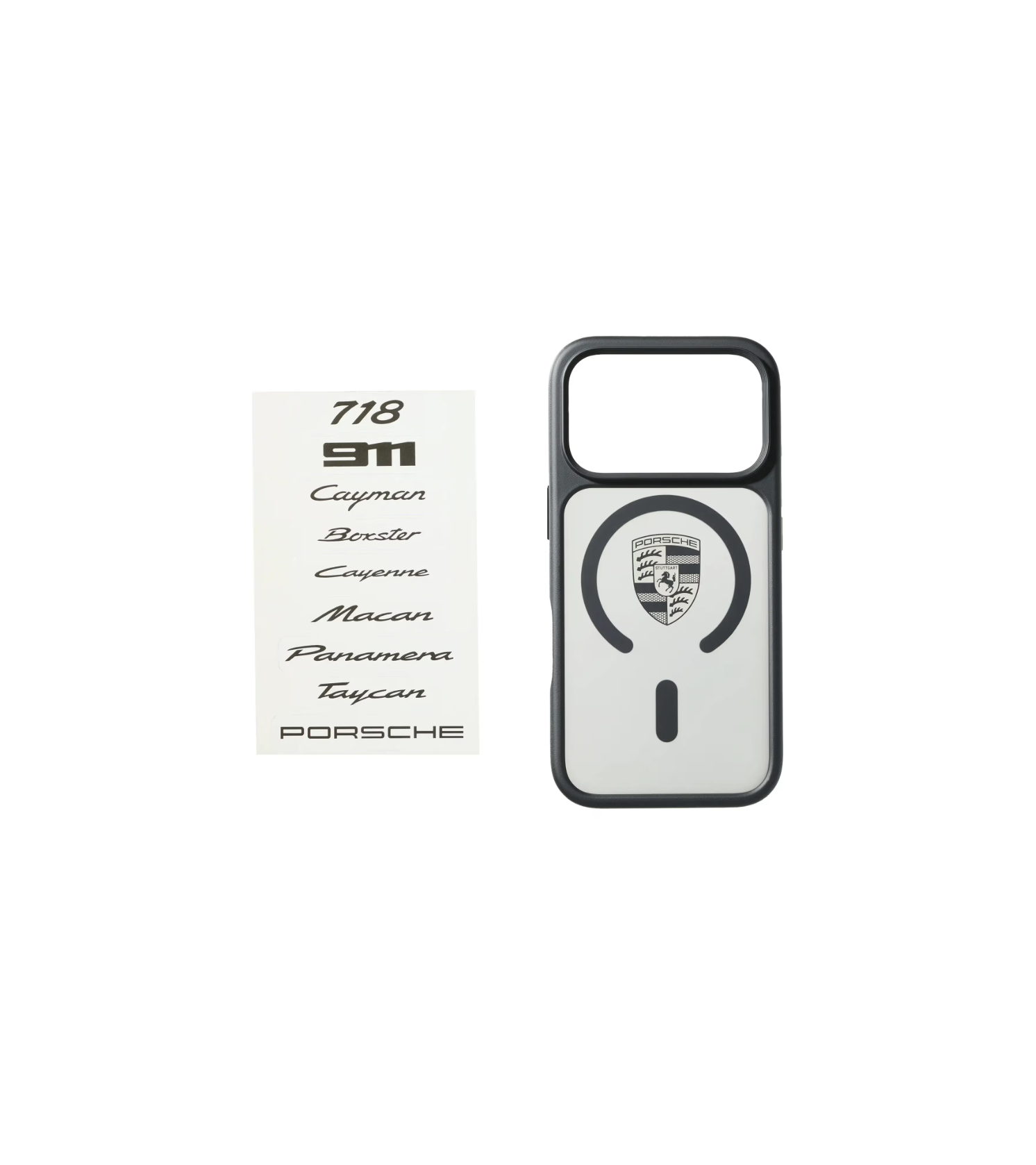 Kiváló minőségű műanyagból készült, Porsche címerrel díszítve.Préselőszerszámok és precíz bemélyedések a kényelmes használat érdekében.Testreszabható a mellékelt Porsche járműfeliratú matricákkal.Alumínium kamerakeret a fokozott védelem érdekében.MagSafe kompatibilis a vezeték nélküli töltéshez.Időtlen tok iPhone® 17 Pro készülékhez.