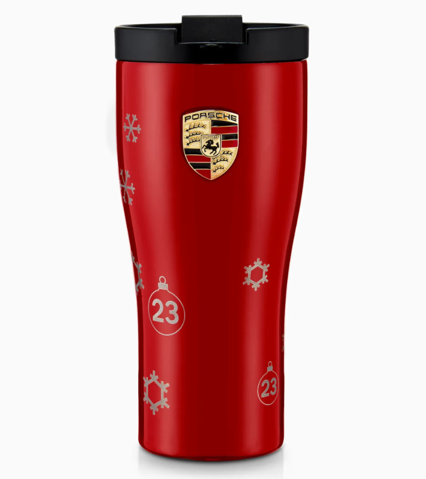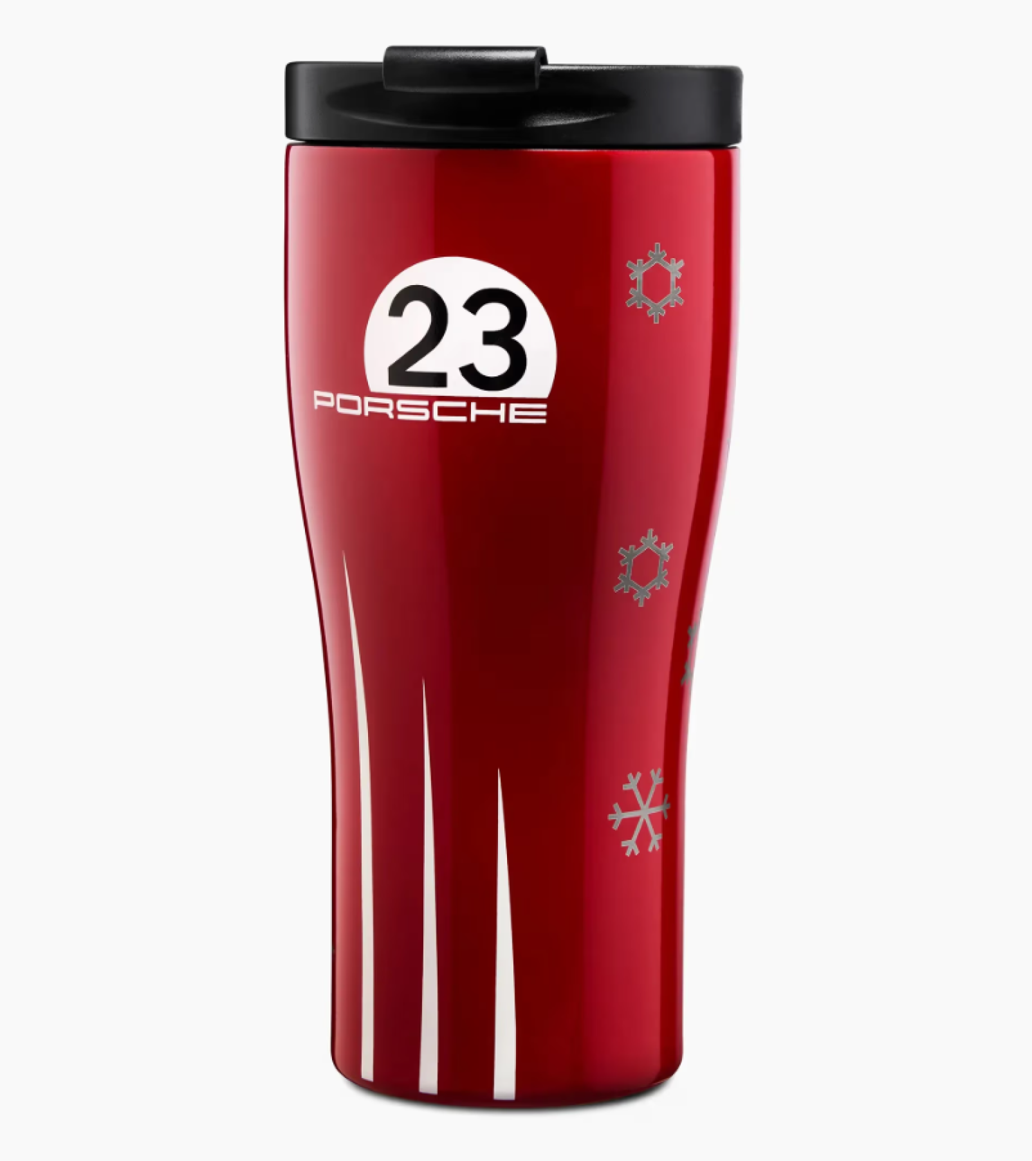 Kizárólag a téli kiadásban: A dupla falú, szivárgásmentes Porsche termoszbögre melegen tartja a forró italokat, és hidegen a hidegeket. A legendás 917 Salzburg dizájn téli hópelyhekkel és ünnepi karácsonyi gömbdíszekkel találkozik, amelyeken a 23-as rajtszám szerepel. A bögre testét a Porsche címer, a fedelét pedig a dombornyomott Porsche logó díszíti. Kiváló minőségű ajándékdobozban csomagolva.