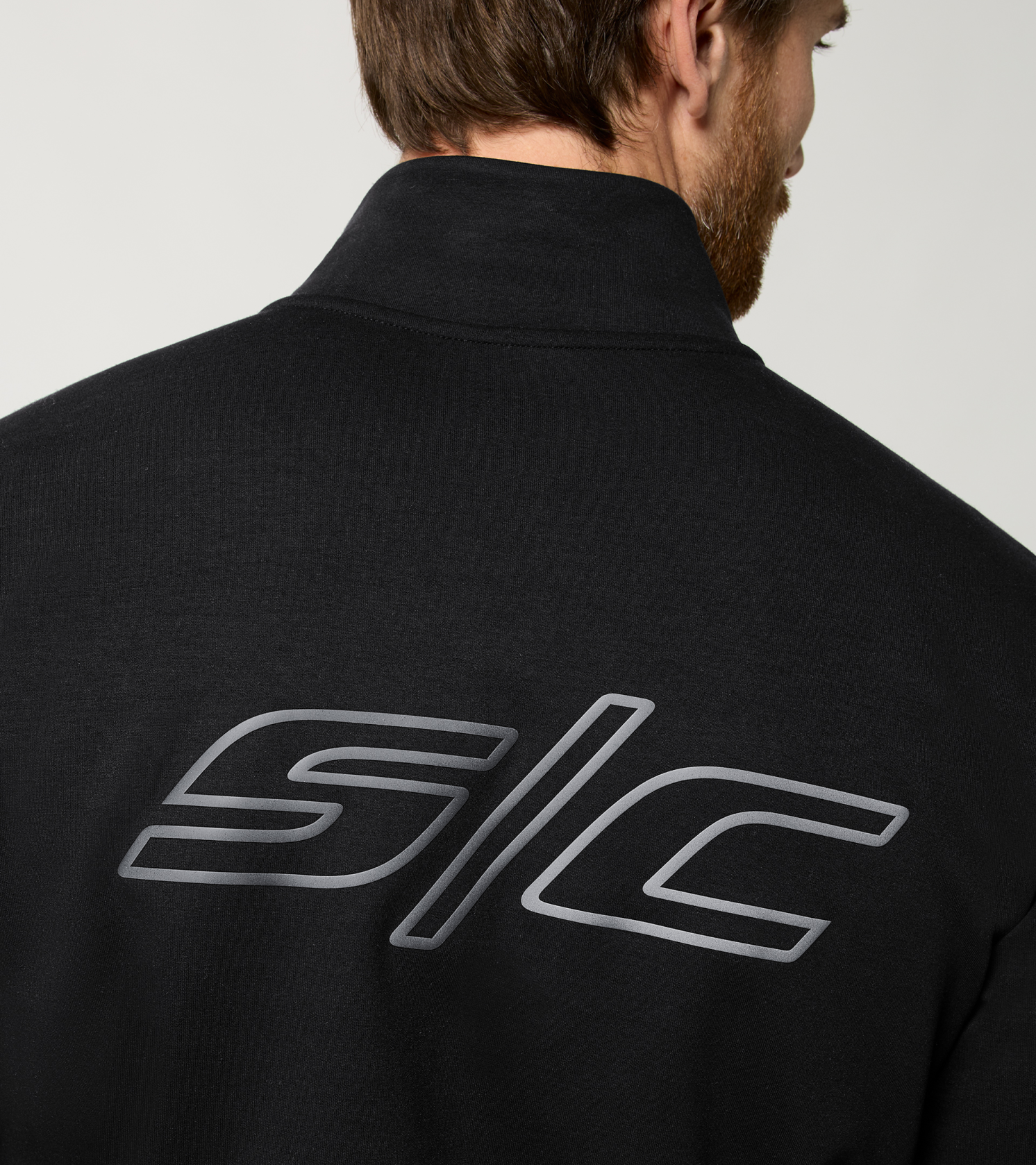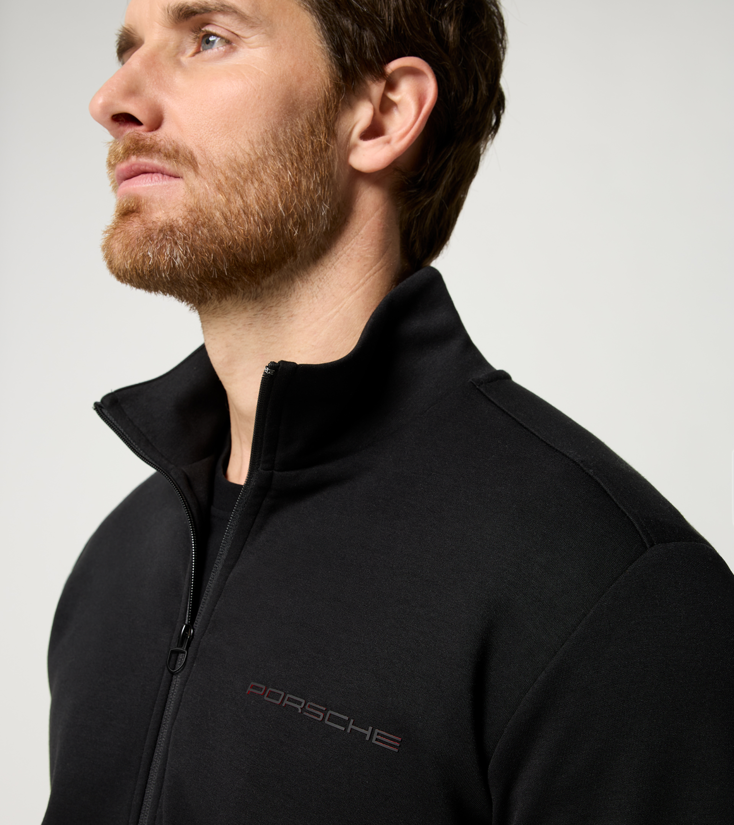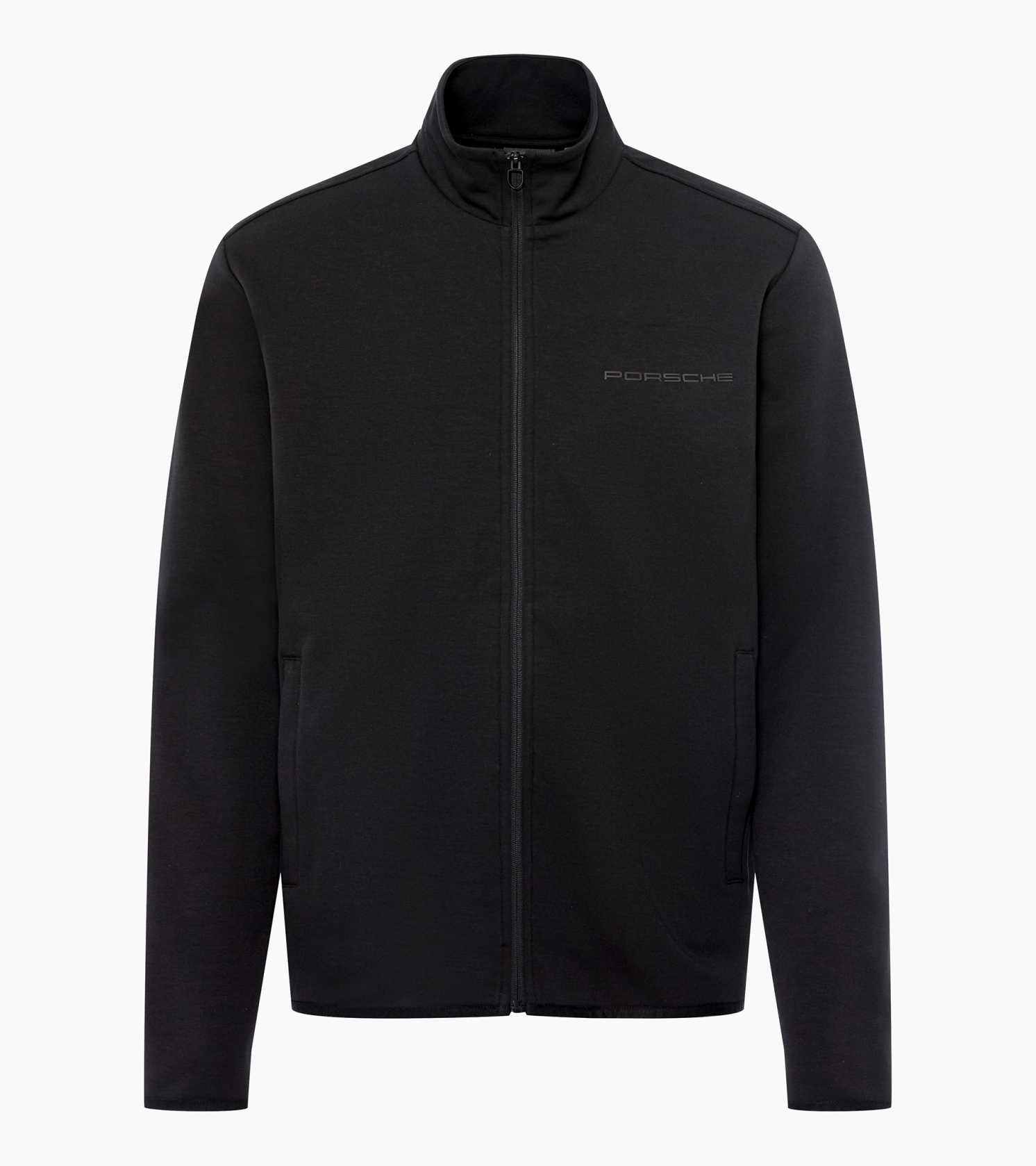 Minimalista unisex edződzseki a Porsche-tól állógallérral és nagyméretű fényvisszaverő felirattal a hátoldalon.