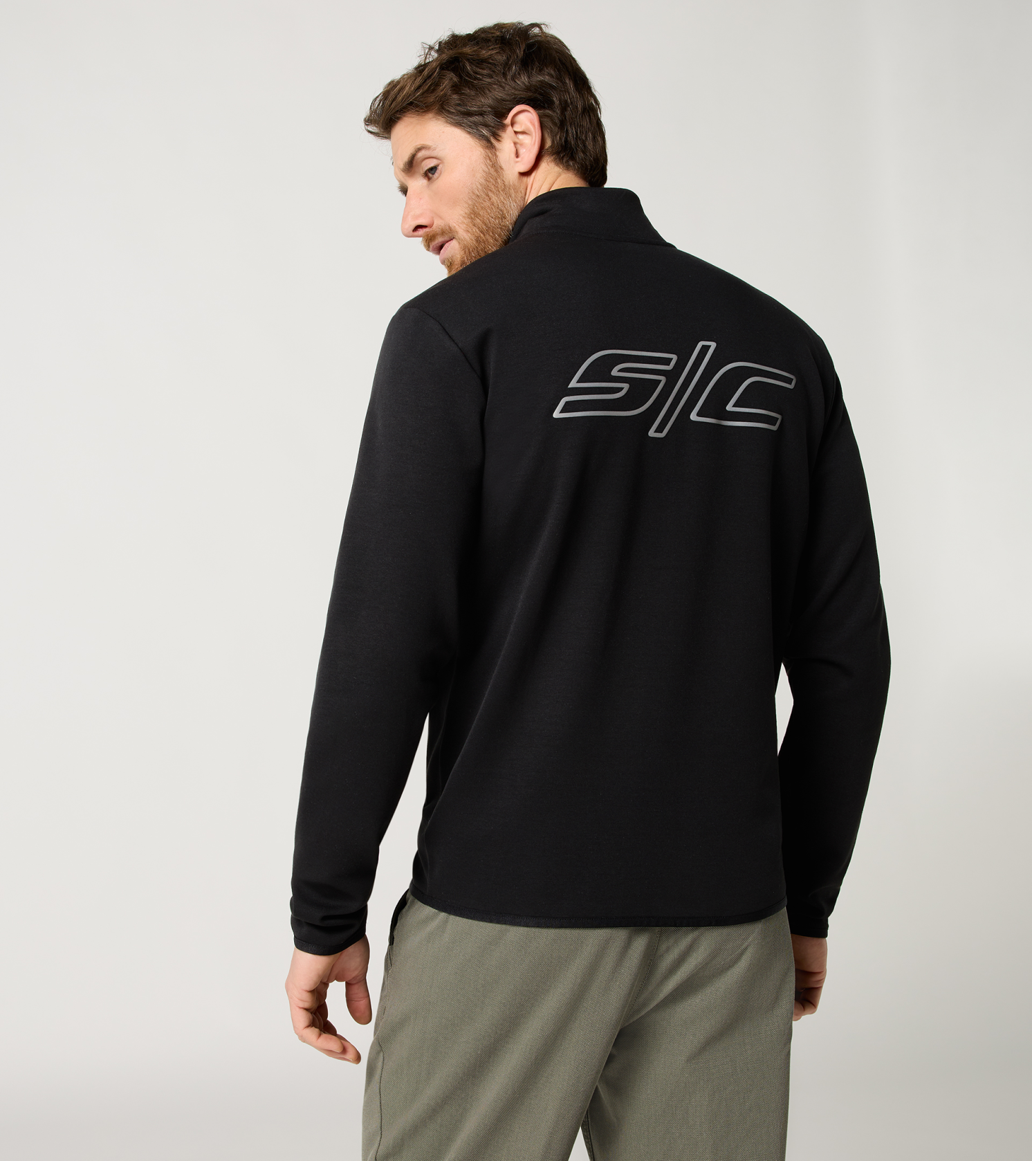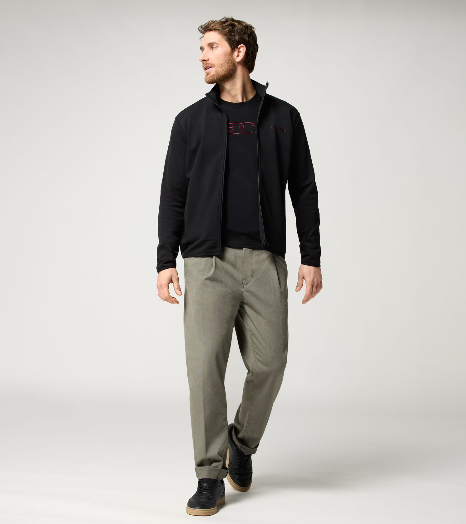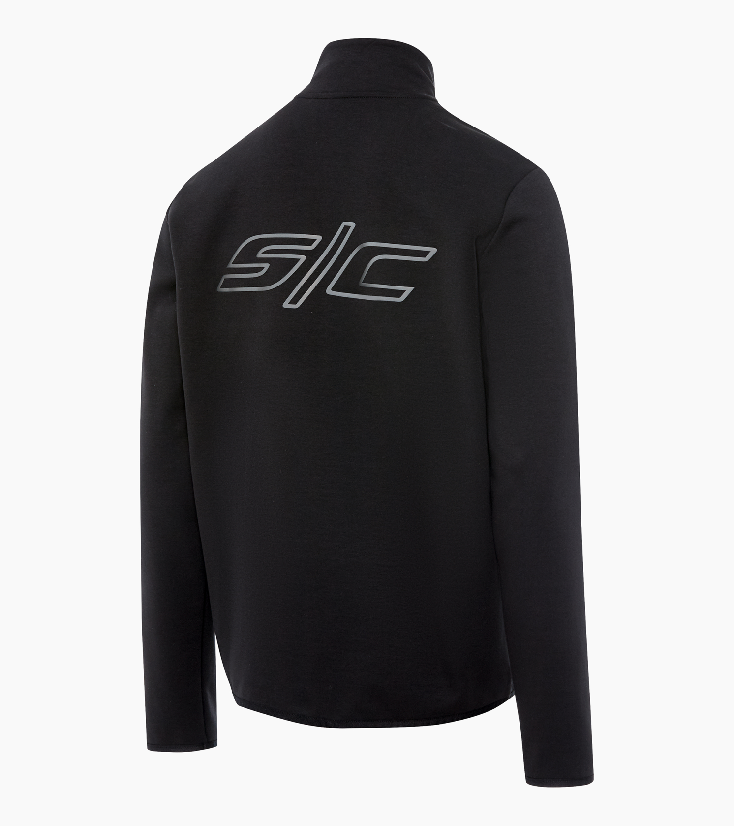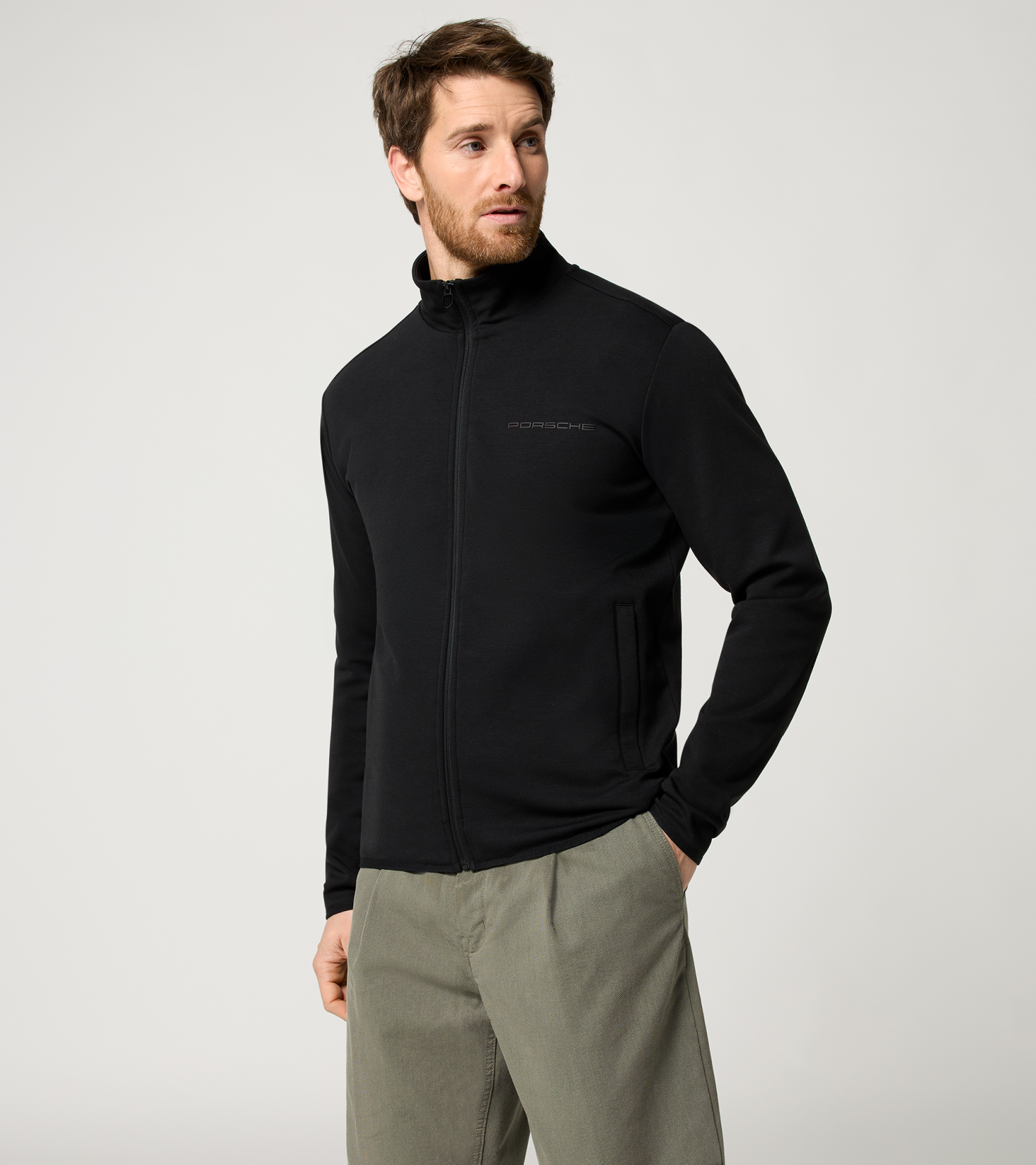 Minimalista unisex edződzseki a Porsche-tól állógallérral és nagyméretű fényvisszaverő felirattal a hátoldalon.